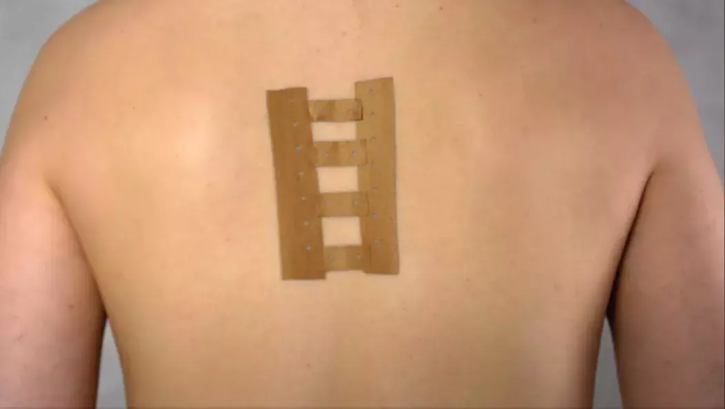 При наклеивании на позвоночник, нарежьте стикер полосами и наклейте его «лесенкой»: две длинные полоски с двух сторон от позвоночника, и несколько коротких между позвонками (в зависимости от размера проблемной зоны). При наклеивании на другую проблемную зону (плечо, локоть, колено, мышцы) стикер надрезается с двух сторон так, чтобы при наклеивании подучилась буква «ж».